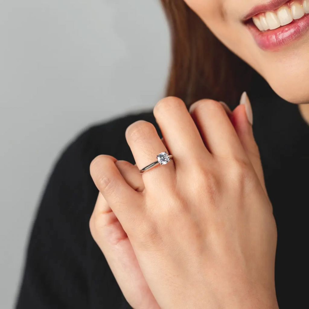 This is a classic style ring featuring a single, prominent gemstone, typically a diamond—set on simple band engagement rings. The central stone is the main feature, making it a timeless and elegant choice. This minimalistic design allows the gemstone to shine without distraction and pairs well with a variety of wedding bands, enhancing its versatility.